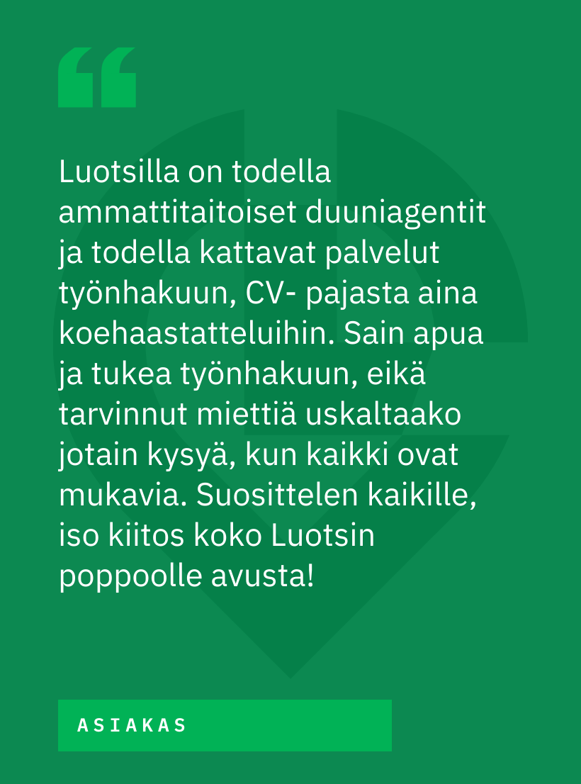Luotsi Pohjois-Karjala toimii kumppaninasi työelämän eri käänteissä koko maakunnan alueella ja tarjoaa myös kaikki työllisyyden viranomaispalvelut helposti ja hymyillen. Liittyipä asiasi työnhakuun, yrittäjyyteen, koulutukseen, uravalintaan, työkykyyn tai rekrytointiin, niin me autamme eteenpäin!