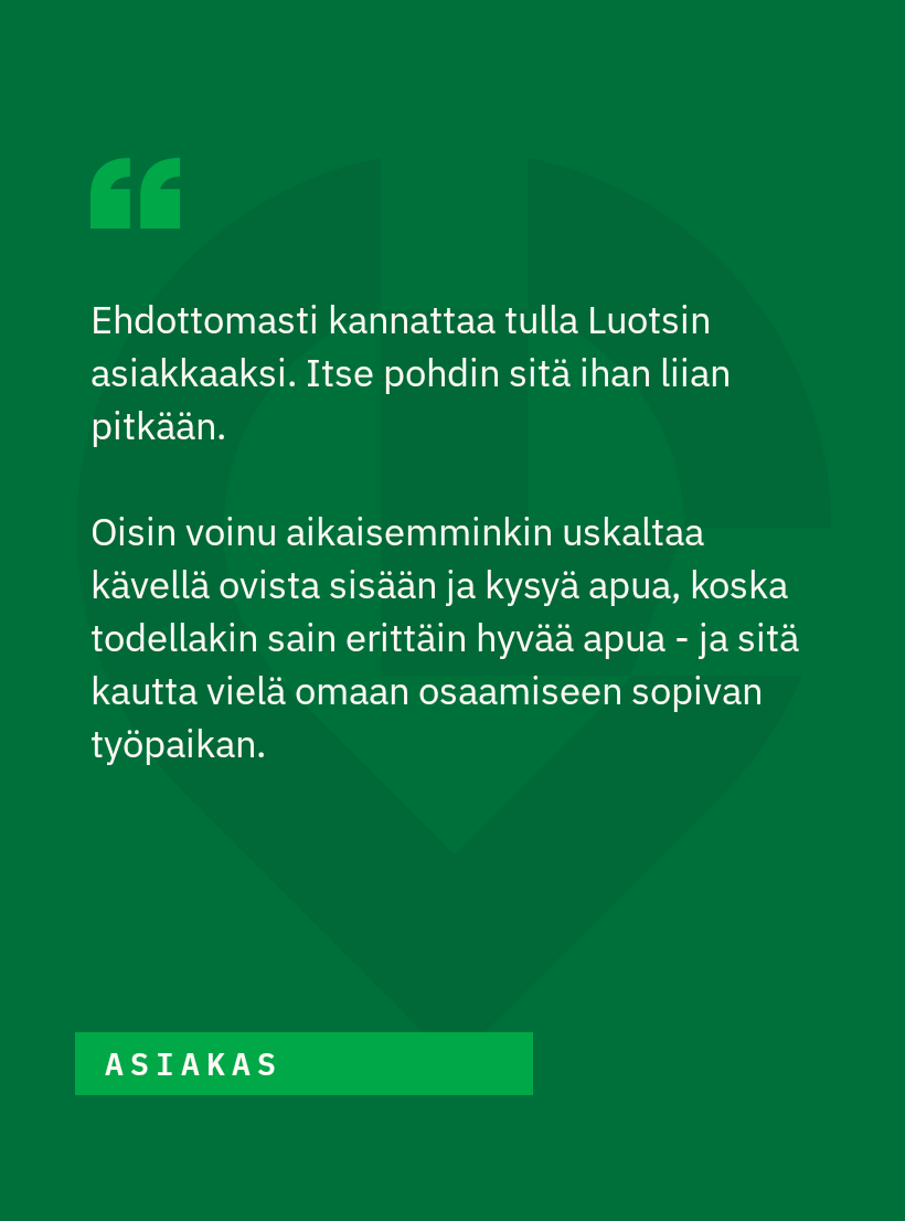 Meillä voit ilmoittautua työnhakijaksi, kehittää ammatillista osaamistasi sekä saada matalan kynnyksen neuvontaa oman kuntasi Luotsi-palvelupisteeltä.